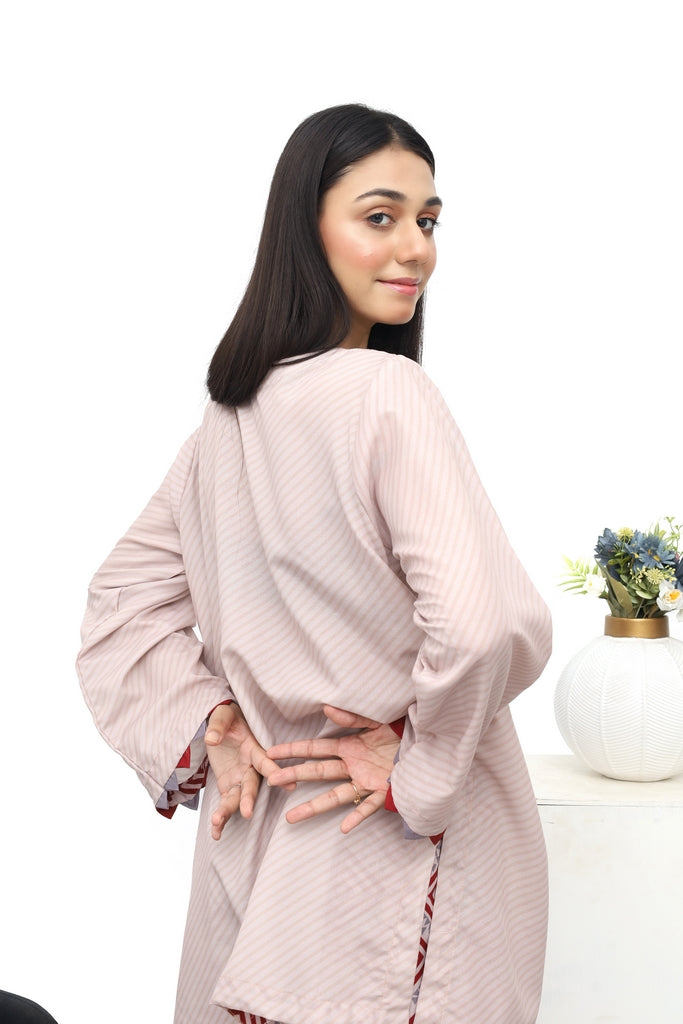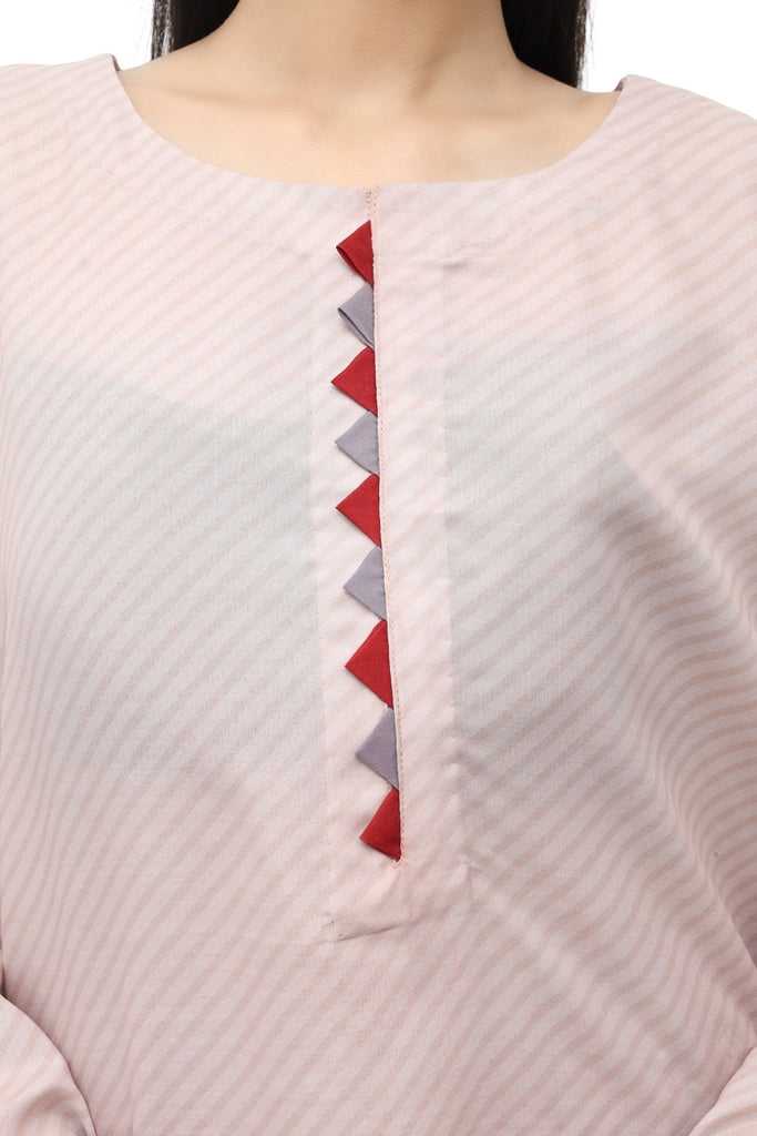 Step out in effortless style with our Striped Tunic and Palazzo Suit. The gentle solid blush pink tunic features a subtle, self-textured stripe and is accented with an eye-catching triangular detail at the neckline and contrasting maroon trim on the sleeves. Paired with wide-leg palazzo trousers boasting a vibrant diamond and geometric print in shades of maroon and cream, this two-piece ensemble is the perfect blend of modern fashion and all-day comfort. Dress it up for an evening out or keep it chic for a casual daytime look.